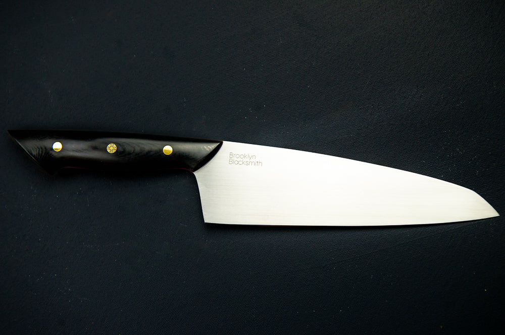 Our classic chef's knife is a perfectly balanced piece of art. It features a special Swedish stainless steel originally created for razor blades. We find that the fine grain structure is ideal for cutlery. Each blade is hardened by the world renowned Paul Bos and lovingly hand sanded to a delicate satin finish. Our design utilises a unique distal taper which provides perfect balance without the need for the bulky metal bolster you find in inferior blades. Our blades are light in the hand, nimble, and a joy to use. The handles are sculpted to conform to your hand and allow for a variety of comfortable hand positions.