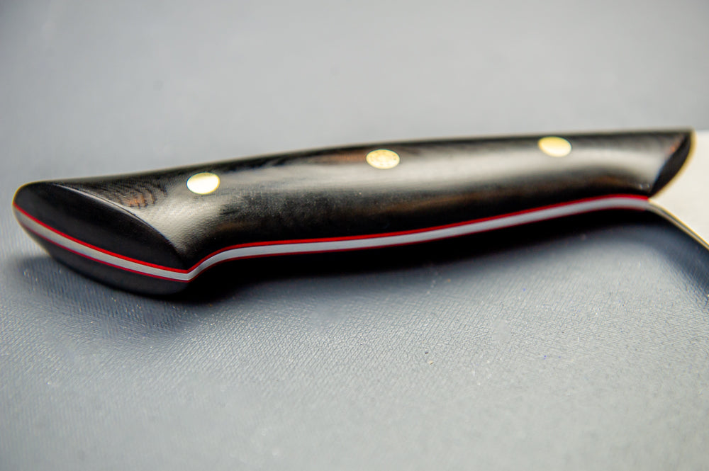 Modern Santoku Chef's Knife- Black Micarta with Medium Red Liners and Brass Mosaic Pin