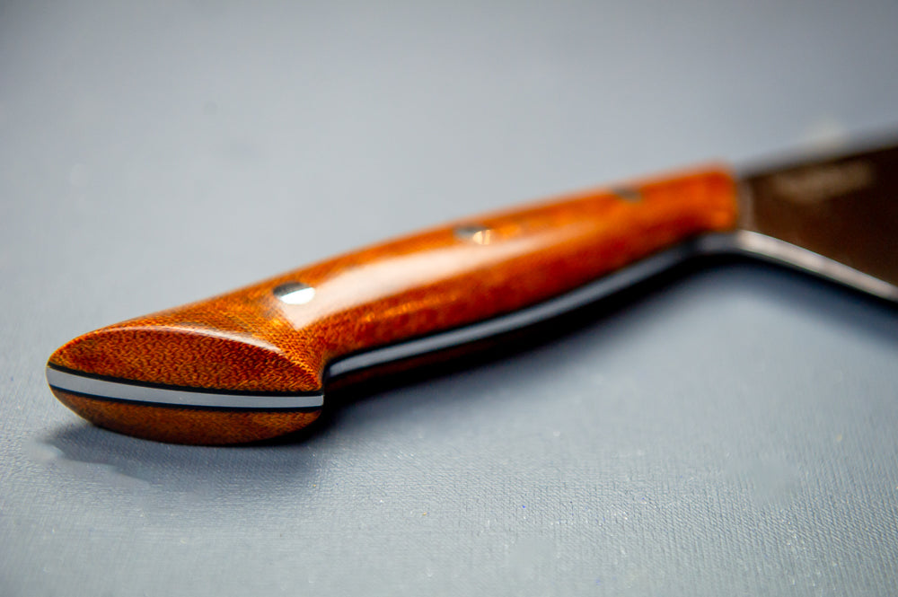 Our classic chef's knife is a perfectly balanced piece of art. It features a special Swedish stainless steel originally created for razor blades. We find that the fine grain structure is ideal for cutlery. Each blade is hardened by the world renowned Paul Bos and lovingly hand sanded to a delicate satin finish. Our design utilises a unique distal taper which provides perfect balance without the need for the bulky metal bolster you find in inferior blades. Our blades are light in the hand, nimble, and a joy to use. The handles are sculpted to conform to your hand and allow for a variety of comfortable hand positions.